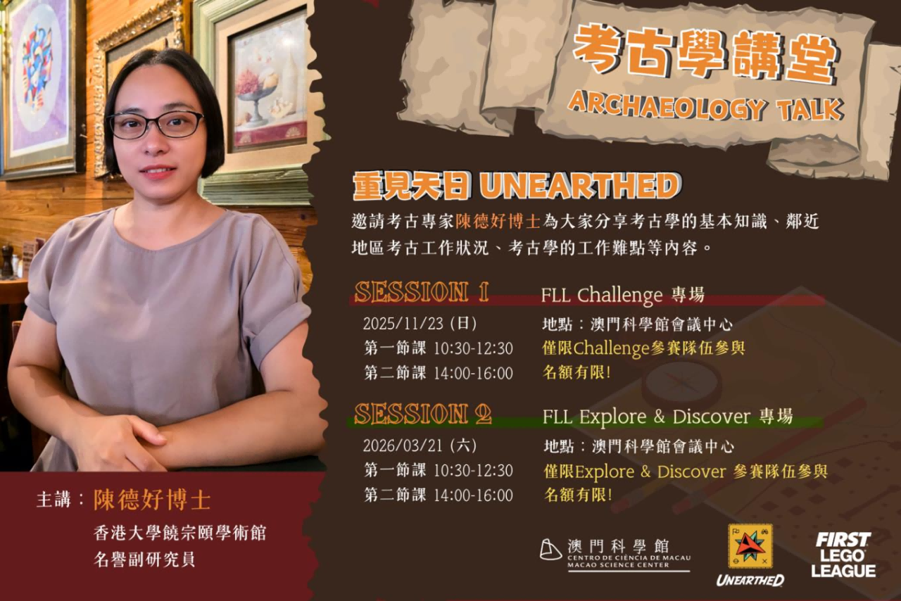 2025/26 FIRST® LEGO® League澳門區總決賽的考古科技之旅即將進入倒計時!Challenge賽事已圓滿落幕,現場精彩紛呈、氣氛熱烈。專屬 Discover & Explore 組的考古學講堂將在 3月21日重磅開講,報名通道將於 3月30日 23:59正式關閉