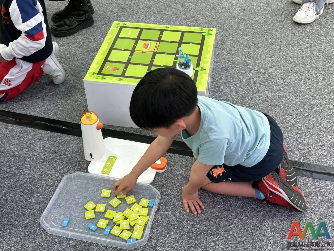 只見他們先認真思考機械人的路徑,將一塊塊編程積木擺放在編程板中,按下啓動,小機械人便在“叢林”中有序的行動起來。最終小選手們突破重重難關,進入競技台進行角逐,機械人你推我躲,控制員靈活應變,小夥伴們互相加油打氣,引起場外大小朋友的陣陣歡呼~?