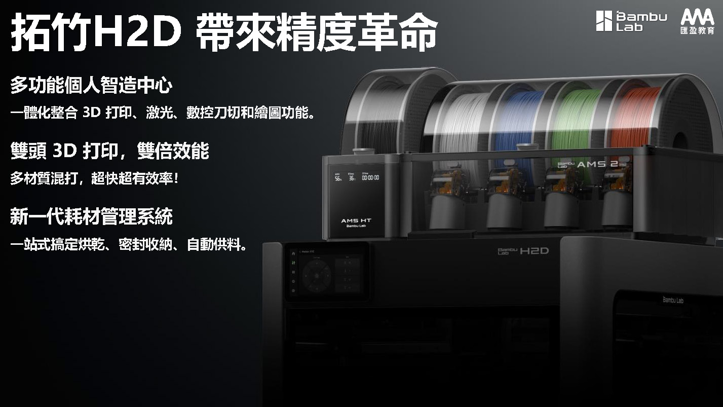 拓竹 H2D 以「重新思考個人製造」為理念,打造集 3D 列印、雷射雕刻 / 切割、數控刀切、繪圖於一體的桌面級智造中心。搭載第二代 3D 列印技術,雙噴嘴支援多色 / 多材料無縫切換,600mm/s 高速列印與 350℃高溫熱端適配 PLA、PA 等多元耗材,配合視覺編碼系統實現 50μm 級運動精度,兼顧效率與細節。模組化設計可拓展 10W/40W 雷射模組(切割 15mm 內椴木)與數控刀具,325×320×325mm 超大成型空間满足大件創作需求。