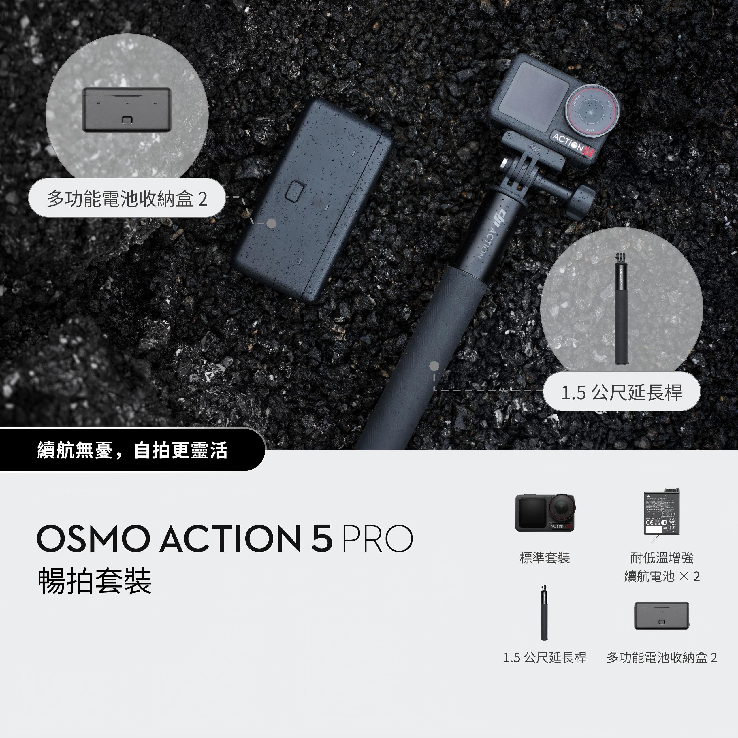 DJI Osmo Action 5 Pro 乃超旗艦運動相機。輕巧且具 20 米裸機防水,1/1.3 英寸傳感器搭配 4nm 芯片,可拍 4K/120fps 影片,支持 32 倍慢放。有 4 小時超長續航,能人物跟隨、360° 地平線增穩,配雙 OLED 觸控屏,各場景拍攝皆出色 。